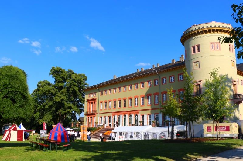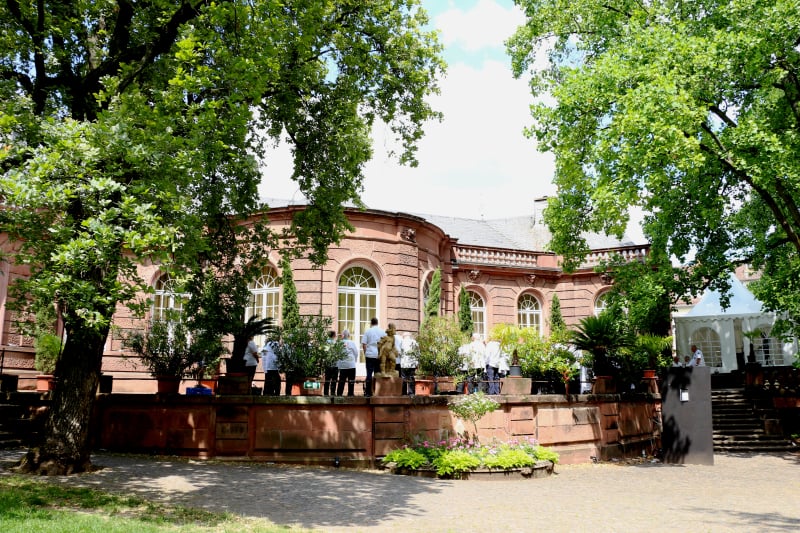 Was für ein Empfang: Kochbrüder, Gäste, Sponsoren und auch Schwägerinnen treten ein in ein wahrhaft kaiserliches Geschehen: Mittelalterliche Rundzelte, bewaffnete Ritter, die Kulisse im Park und auf der Freitreppe zu Schloss Herrnsheim einfach großartig – Mittelaltermarkt – ein einmaliges Erlebnis. Das Fanfarencorps der Nibelungenstadt Worms, perfekt, unterhält uns mit einem Standkonzert. Ein Bier- und ein Weinstand löschen den Durst.