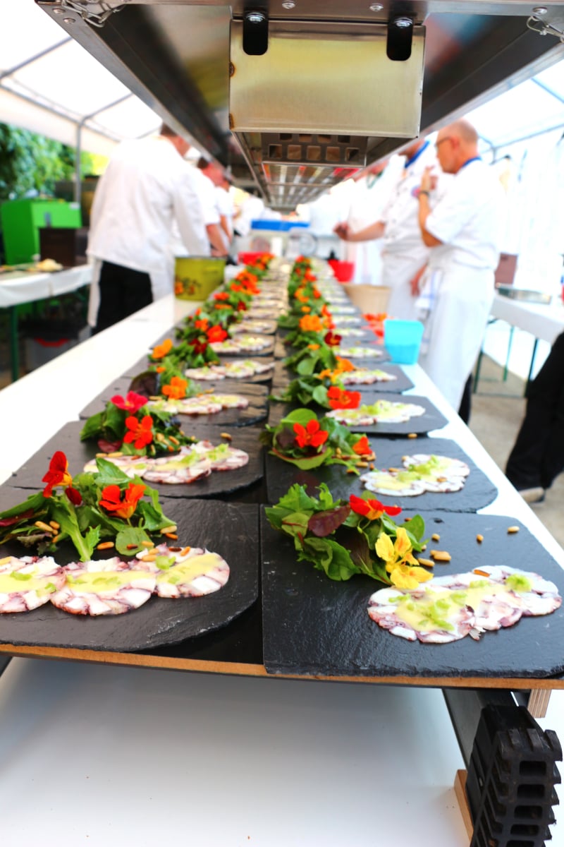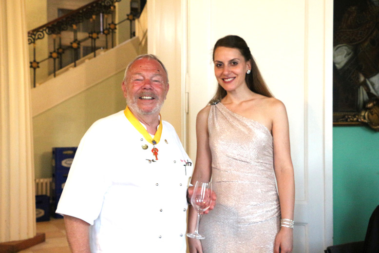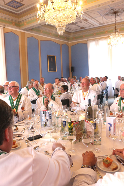 Hier besonders hervorzuheben muss man GMdC Wilfried Neudecker „Soßen Willi“, der ebenso wie LK GMdC Dr. Herbert Geipert, ganze Gänge vorbereitete. Wer glaubt, dass das schon alles ist, wird eines Besseren belehrt: Bernd ruft zum Eintreten in die Festräume, wieder sitzen Kapitel und Großkapitel in bunter Reihe mit Sponsoren und Kochbrüdern. Und hier werden für über 100 Personen 5 Gänge auf hohem Niveau, dazu Spitzenweine – darunter „Große Gewächse“ – organisiert von Chuchileiter Bruder Hans und gestiftet von regionalen Winzern perfekt serviert. Zusammen mit dem Schirmherren, Oberbürgermeister Michael Kissel, erlebten Brüder und Gäste neben dem fulminanten Menü ein buntes Programm.